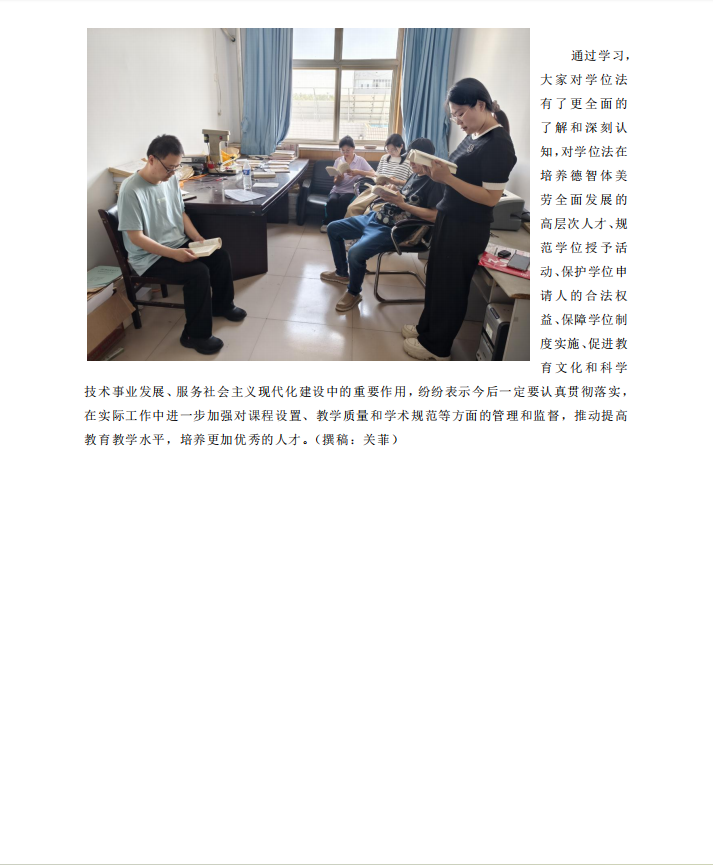 【信计教研室党支部】6月13日,信息与计算科学教研室党支部组织全体教师认真学习了《中华人民共和国学位法》(2024年4月26日第十四届全国人民代表大会常务委员会第九次会议通过并即将于2025年1月1日起施行),原原本本学、结合教学科研工作实际学。