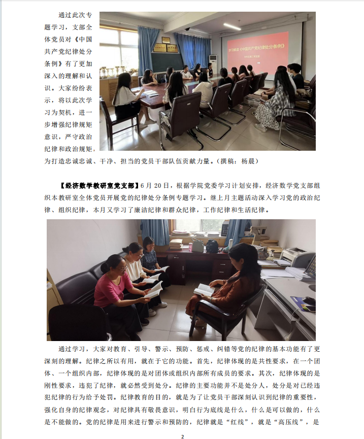 【经济数学教研室党支部】6月20日,根据公司党委学习计划安排,经济数学党支部组织本教研室全体党员开展党的纪律处分条例专题学习。继上月主题活动深入学习党的政治纪律、组织纪律,本月又学习了廉洁纪律和群众纪律,工作纪律和生活纪律。