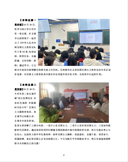 【本科生第一党支部】10月26日,数学与统计学本科生第一党支部,在支部书记的带领下一起学习了《中华人民共和国爱国主义教育法》。共5章40条,包括总则、职责任务、实施措施、支持保障、附则。通过学习,让支部全体党员深刻理解它的颁布意义和目的。它的颁布标志着我国爱国主义教育法治体系正逐步完善,对爱国主义教育的具体落实和成效提升具有根本性、全局性和长远性作用。