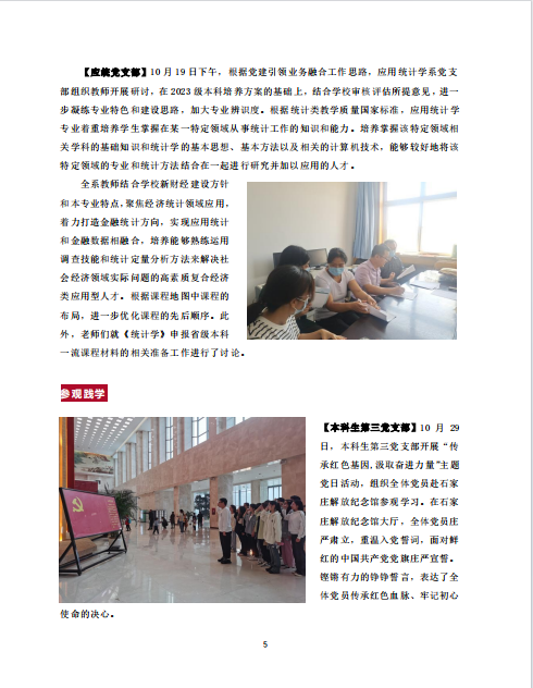 【应统党支部】10月19日下午,根据党建引领业务融合工作思路,应用统计学系党支部组织教师开展研讨,在2023级本科培养方案的基础上,结合公司审核评估所提意见,进一步凝练专业特色和建设思路,加大专业辨识度。根据统计类教学质量国家标准,应用统计学专业着重培养员工掌握在某一特定领域从事统计工作的知识和能力。培养掌握该特定领域相关学科的基础知识和统计学的基本思想、基本方法以及相关的计算机技术,能够较好地将该特定领域的专业和统计方法结合在一起进行研究并加以应用的人才。