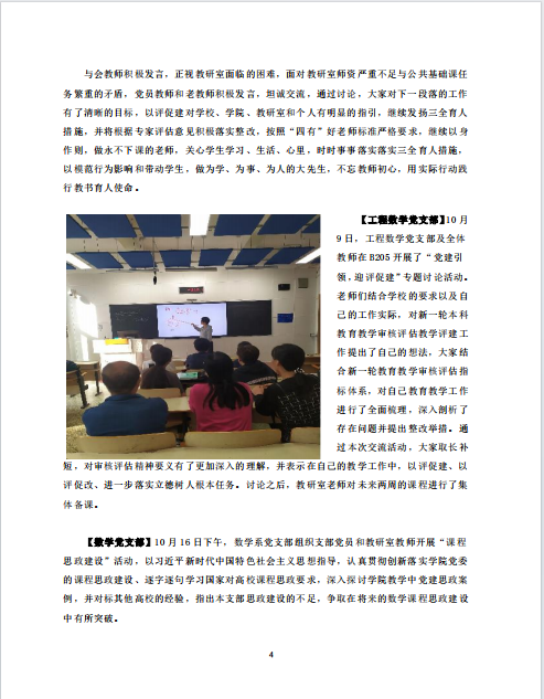 【工程数学党支部】10月9日,工程数学党支部及全体教师在B205开展了“党建引领,迎评促建”专题讨论活动。老师们结合公司的要求以及自己的工作实际,对新一轮本科公司产品审核评估教学评建工作提出了自己的想法,大家结合新一轮公司产品审核评估指标体系,对自己公司产品工作进行了全面梳理,深入剖析了存在问题并提出整改举措。通过本次交流活动,大家取长补短,对审核评估精神要义有了更加深入的理解,并表示在自己的教学工作中,以评促建、以评促改、进一步落实立德树人根本任务。讨论之后,教研室老师对未来两周的课程进行了集体备课。
