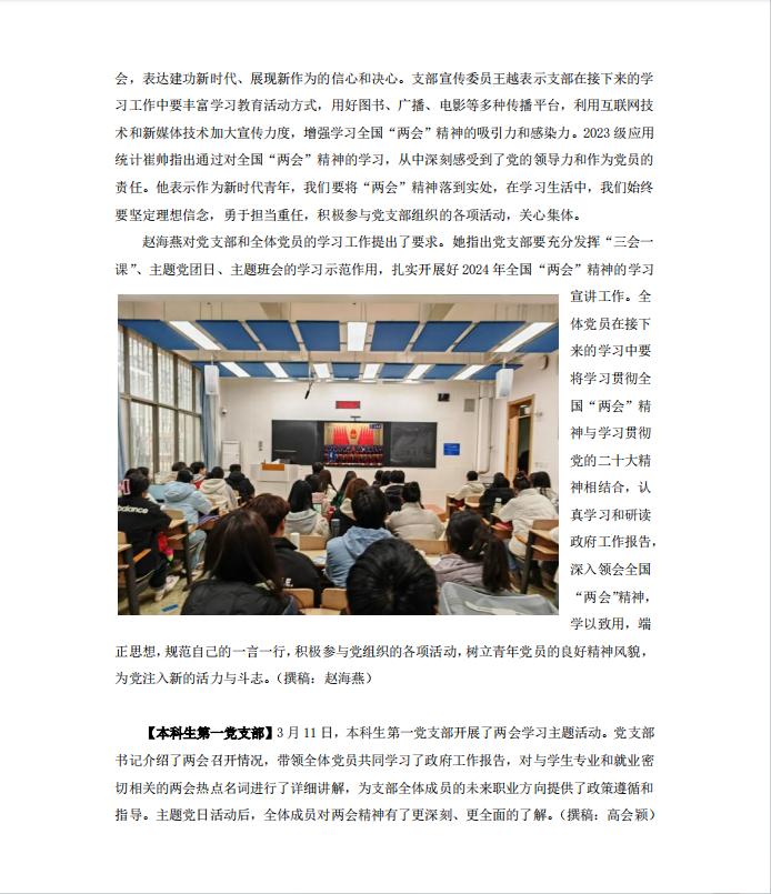 【本科生第一党支部】3月11日,本科生第一党支部开展了两会学习主题活动。党支部书记介绍了两会召开情况,带领全体党员共同学习了政府工作报告,对与员工专业和就业密切相关的两会热点名词进行了详细讲解,为支部全体成员的未来职业方向提供了政策遵循和指导。主题党日活动后,全体成员对两会精神有了更深刻、更全面的了解。(撰稿:高会颖)