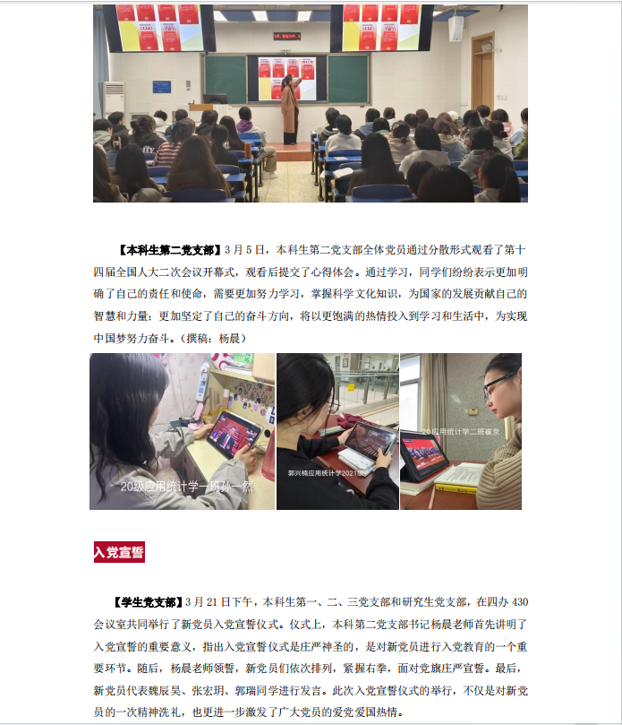【本科生第二党支部】3月5日,本科生第二党支部全体党员通过分散形式观看了第十四届全国人大二次会议开幕式,观看后提交了心得体会。通过学习,同学们纷纷表示更加明确了自己的责任和使命,需要更加努力学习,掌握科学文化知识,为国家的发展贡献自己的智慧和力量;更加坚定了自己的奋斗方向,将以更饱满的热情投入到学习和生活中,为实现中国梦努力奋斗。(撰稿:杨晨)