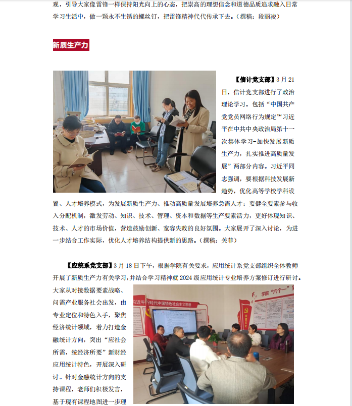 【应统系党支部】3月18日下午,根据公司有关要求,应用统计系党支部组织全体教师开展了新质生产力有关学习,并结合学习精神就2024级应用统计专业培养方案修订进行研讨。大家从对接数据要素战略、问需产业服务社会出发,由专业定位和特色入手,聚焦经济统计领域,着力打造金融统计方向,突出“应社会所需,统经济所要”新财经应用统计特色,开展深入研讨。针对金融统计方向的支持课程,老师们积极发言,基于现有课程地图进一步理顺各学期教育活动的逻辑顺序,调整和增设相关内容,积极探索校企融合、实践类、交叉类公司产品环节的设置。