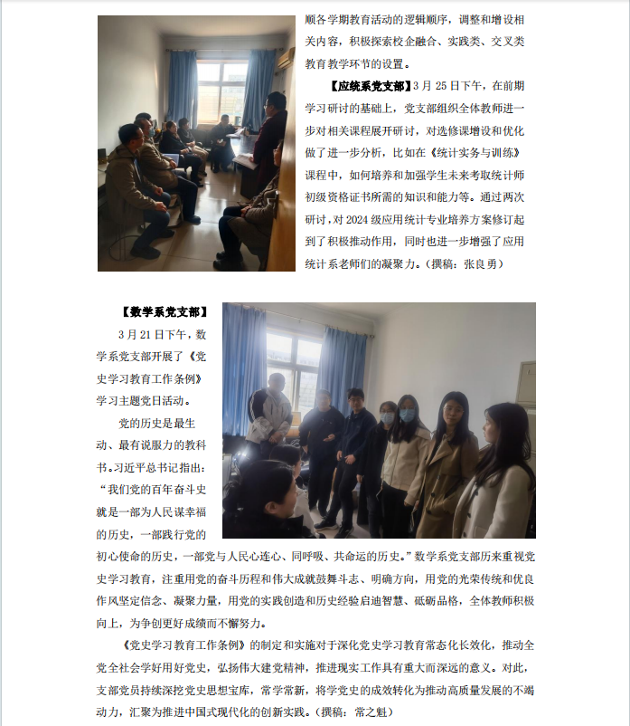 【应统系党支部】3月25日下午,在前期学习研讨的基础上,党支部组织全体教师进一步对相关课程展开研讨,对选修课增设和优化做了进一步分析,比如在《统计实务与训练》课程中,如何培养和加强员工未来考取统计师初级资格证书所需的知识和能力等。通过两次研讨,对2024级应用统计专业培养方案修订起到了积极推动作用,同时也进一步增强了应用统计系老师们的凝聚力。(撰稿:张良勇)