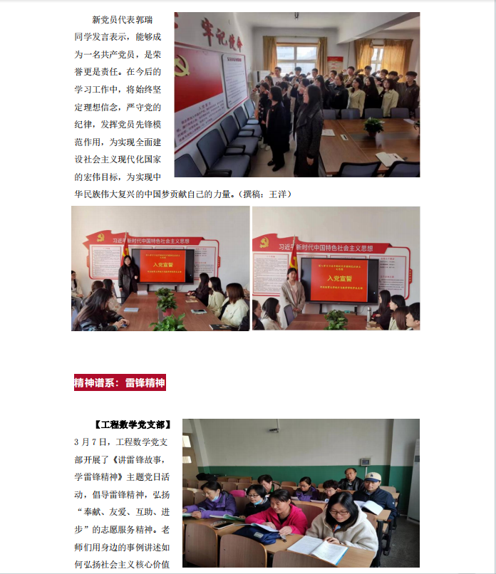【工程数学党支部】3月7日,工程数学党支部开展了《讲雷锋故事,学雷锋精神》主题党日活动,倡导雷锋精神,弘扬“奉献、友爱、互助、进步”的志愿服务精神。老师们用身边的事例讲述如何弘扬社会主义核心价值观,引导大家像雷锋一样保持阳光向上的心态,把崇高的理想信念和道德品质追求融入日常学习生活中,做一颗永不生锈的螺丝钉,把雷锋精神代代传承下去。(撰稿:段丽凌)