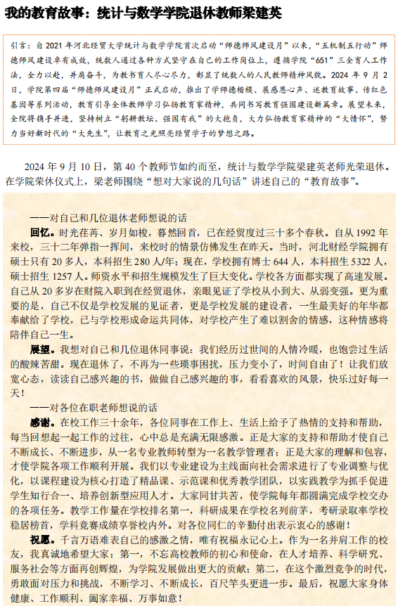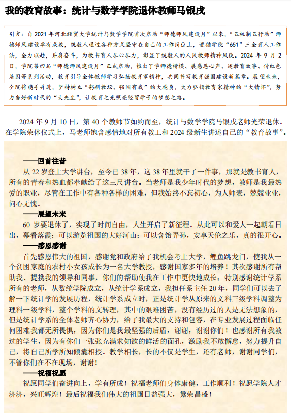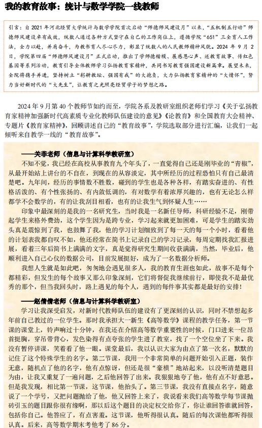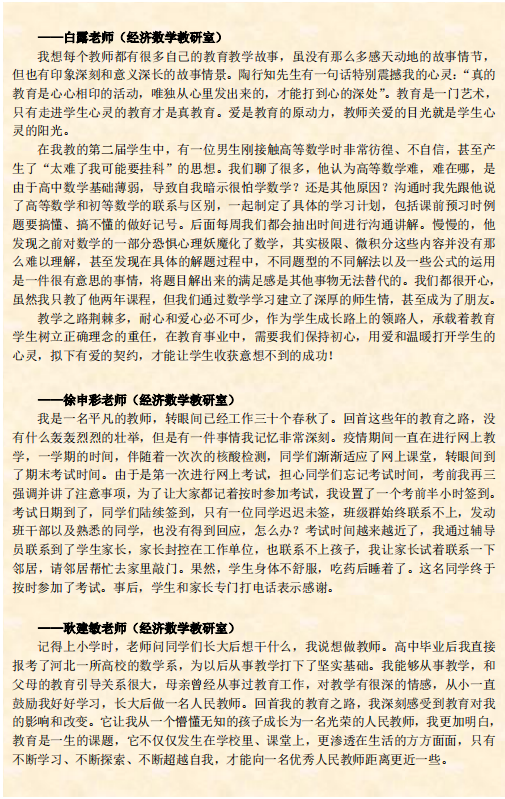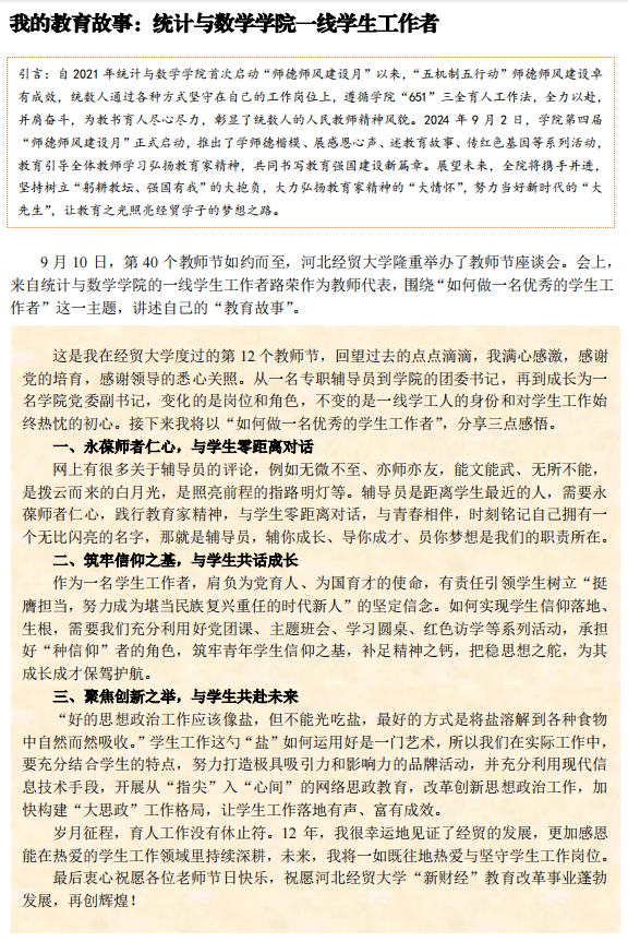 自2021年william威廉英国官网首次启动“师德师风建设月”以来,“五机制五行动”师德师风建设卓有成效,统数人通过各种方式坚守在自己的工作岗位上,遵循公司“651”三全育人工作法,全力以赴,并肩奋斗,为教书育人尽心尽力,彰显了统数人的人民教师精神风貌。2024年9月2日,公司第四届“师德师风建设月”正式启动,推出了学师德楷模、展感恩心声、述教育故事、传红色基因等系列活动,教育引导全体教师学习弘扬教育家精神,共同书写教育强国建设新篇章。展望未来,全院将携手并进,坚持树立“躬耕教坛、强国有我”的大抱负,大力弘扬教育家精神的“大情怀”,努力当好新时代的“大先生”,让教育之光照亮经贸学子的梦想之路。