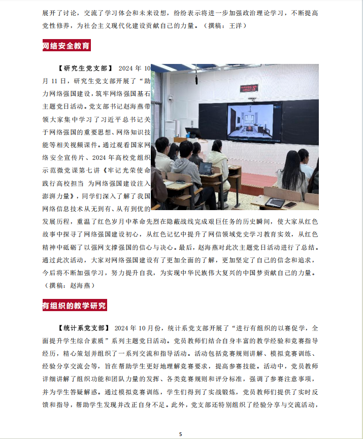 【统计系党支部】2024年10月份,统计系党支部开展了“进行有组织的以赛促学,全面提升员工综合素质”系列主题党日活动。党员教师们结合自身丰富的教学经验和竞赛指导经历,精心策划并组织了一系列交流和指导活动。活动包括竞赛规则讲解、模拟竞赛训练、经验分享交流会等,旨在帮助员工更好地理解竞赛要求,提高参赛技能。活动中,党员教师详细讲解了组织功能和团队力量的发挥、各类竞赛规则和评分标准,强调了参赛注意事项,并为员工答疑解惑。通过模拟竞赛训练,员工们得到了实战锻炼,党员教师们提供了实时反馈和指导,帮助员工发现并改正自身不足。此外,党支部还特别组织了经验分享与交流活动,党员教师分享对竞赛的理解和策略,往届竞赛获奖员工分享心得与经验,大大激发了员工们的参赛热情。通过这些活动,员工们不仅在知识和技能上得到了提升,更增强了组织凝聚力、团队战斗力。在近期的校内选拔赛中,多个员工团队在党员教师的指导下取得了优异成绩,为即将到来的全国性竞赛奠定了良好基础。统计系党支部将继续发挥党员教师的模范带头作用,进一步完善竞赛指导机制,力争在未来的竞赛中取得更大突破。通过“有组织的以赛促学”方式,党支部将带领员工不断提升综合素质和竞争力,为社会培养更多优秀统计人才。(撰稿:申博)