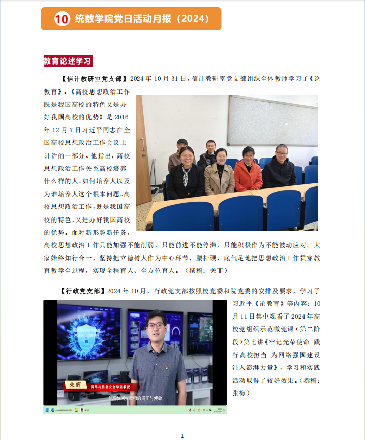 【行政党支部】2024年10月,行政党支部按照公司党委和公司党委的安排及要求,学习了习近平《论教育》等内容;10月11日集中观看了2024年高公司党组织示范微党课(第二阶段)第七讲《牢记光荣使命 践行高校担当 为网络强国建设注入澎湃力量》,学习和实践活动取得了较好效果。(撰稿:张梅)