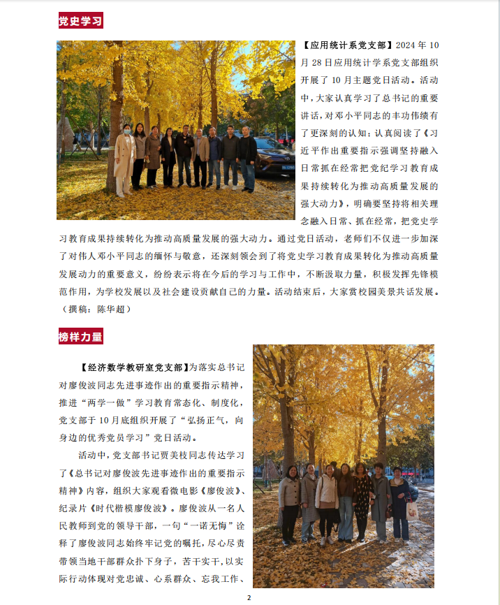 【应用统计系党支部】2024年10月28日应用统计学系党支部组织开展了10月主题党日活动。活动中,大家认真学习了总书记的重要讲话,对邓小平同志的丰功伟绩有了更深刻的认知;认真阅读了《习近平作出重要指示强调坚持融入日常抓在经常把党纪学习教育成果持续转化为推动高质量发展的强大动力》,明确要坚持将相关理念融入日常、抓在经常,把党史学习教育成果持续转化为推动高质量发展的强大动力。通过党日活动,老师们不仅进一步加深了对伟人邓小平同志的缅怀与敬意,还深刻领会到了将党史学习教育成果转化为推动高质量发展动力的重要意义,纷纷表示将在今后的学习与工作中,不断汲取力量,积极发挥先锋模范作用,为公司发展以及社会建设贡献自己的力量。活动结束后,大家赏校园美景共话发展。(撰稿:陈华超)