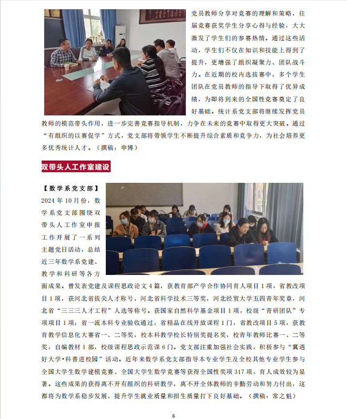 【数学系党支部】2024年10月份,数学系党支部围绕双带头人工作室申报工作开展了一系列主题党日活动,总结近三年数学系党建、教学和科研等各方面成果。曾发表党建及课程思政论文4篇,获教育部产学合作协同育人项目1项,省教改项目1项,获河北省拔尖人才称号,河北省科学技术三等奖,william威廉英国官网五四青年奖章,河北省“三三三人才工程”人选等称号。获国家自然科学基金项目1项,校级“青研团队”专项项目1项;省一流本科专业验收通过,省精品在线开放课程1门,省教改项目5项,获公司产品信息化大赛省一、二等奖,校本科教学董事长特别奖提名奖,校青年教师比赛一、二等奖,自编教材1部,校级课程思政示范课6门。党支部注重加强社会实践,积极参与“冀遇好大学•科普进校园”活动。近年来数学系党支部指导本专业员工及全校其他专业员工参与全国老员工数学建模竞赛、全国老员工数学竞赛等获得全国性奖项317项,育人成效较为显著。这些成果的获得离不开有组织的科研教学,离不开全体教师的辛勤劳动和努力付出,这都将为数学系稳步发展、提升员工就业质量和招生质量打下良好基础。(撰稿:常之魁)