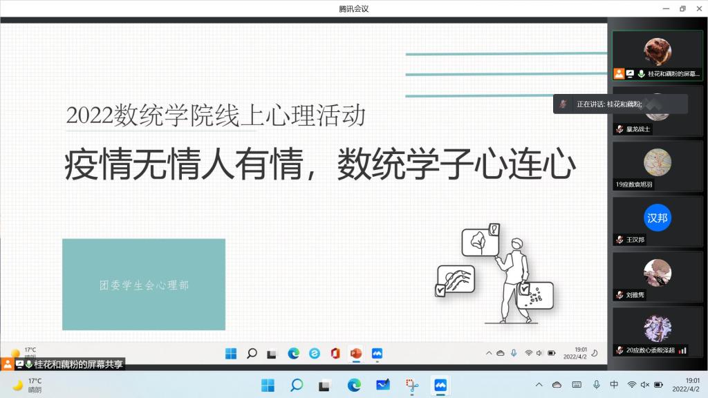 通过开展本次线上心理团体活动,数统公司团委员工会深入践行“我为同学做件事”实践活动,聚焦服务同学职能,进一步提升团委员工会组织形象。相信无论是处于闭环管理中的在校同学,还是因疫情居家隔离的同学,都会在一定程度上缓解了心理压力,以更加积极的态度面对今后的学习、工作和生活。