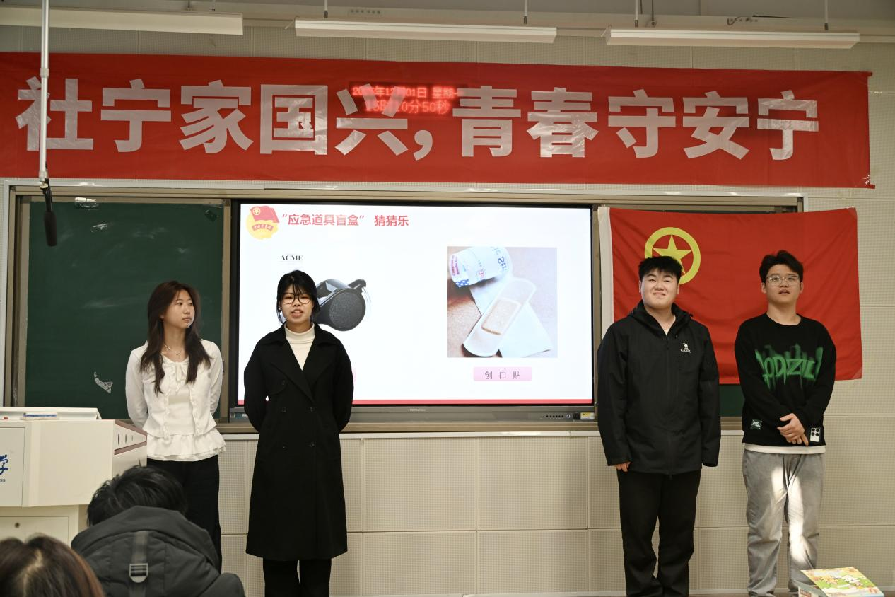 “应急道具盲盒”猜猜乐环节点燃活动气氛。四位同学分别向大家介绍了手电筒、压缩饼干、哨子、创可贴等应急道具的重要作用,借此提醒大家做好日常应急准备,趣味形式让应急知识更易理解,切实提升了同学们的社会安全防范与应急储备意识。