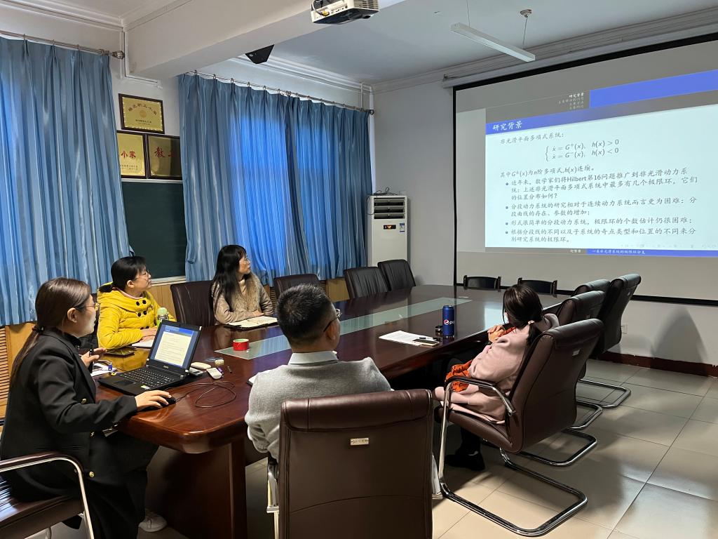 赵倩倩老师首先用非常常见并具体的例子介绍了极限环的概念,及非光滑动力系统在实际当中的一些应用;接着介绍了分段边界在非光滑系统中至关重要的作用,及它的改变会对系统造成的影响和发生的新现象;最后详细介绍了一类分段线为同一起点的两条射线的线性非光滑系统的极限环分支。赵倩倩老师的报告图文并茂,详实具体,在座的各位老师与同学和张立华老师就报告中的内容进行了深入探讨。