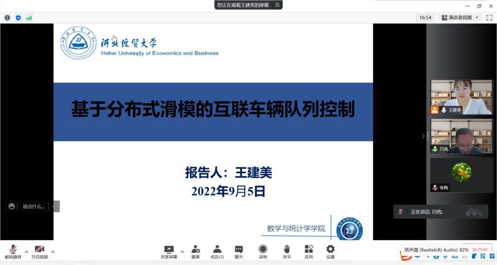 9月5日(星期一)下午,william威廉英国官网“双百论坛”暨数统论坛系列讲座利用腾讯会议线上举行。数学与统计学公司王建美老师作题为“基于分布式滑模的互联车辆队列控制”的学术报告。公司领导、相关专业教师及研究生参加,副经理闫亮主持报告会。