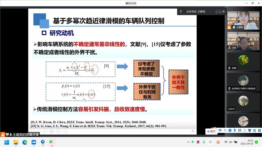 王建美老师首先介绍了互联车辆队列控制的背景和意义;介绍了基于分布式滑模的互联车辆队列控制方法及仿真验证,结合仿真结果展示分析了外界干扰、输入饱和约束以及传统滑模控制方法等对车队系统稳定性的影响。通过设计干扰观测器、神经网络对车队系统中的外界干扰进行有效地估计补偿,采取多幂次趋近律及非奇异终端滑模控制算法,提高系统的收敛速度和稳定性。最后从研究结果出发,提出了混合驾驶将是未来的热点之一,是未来互联车辆队列控制亟待解决的问题。