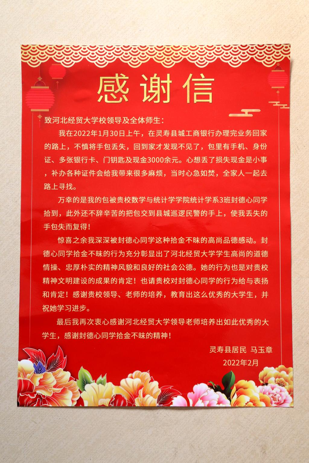 经公司研究决定,对封德心同学的行为给予通报表扬,并号召全院员工向封德心同学学习,学习她拾金不昧的道德品质,继承和发扬中华民族的传统美德,为建设文明和谐校园贡献力量。