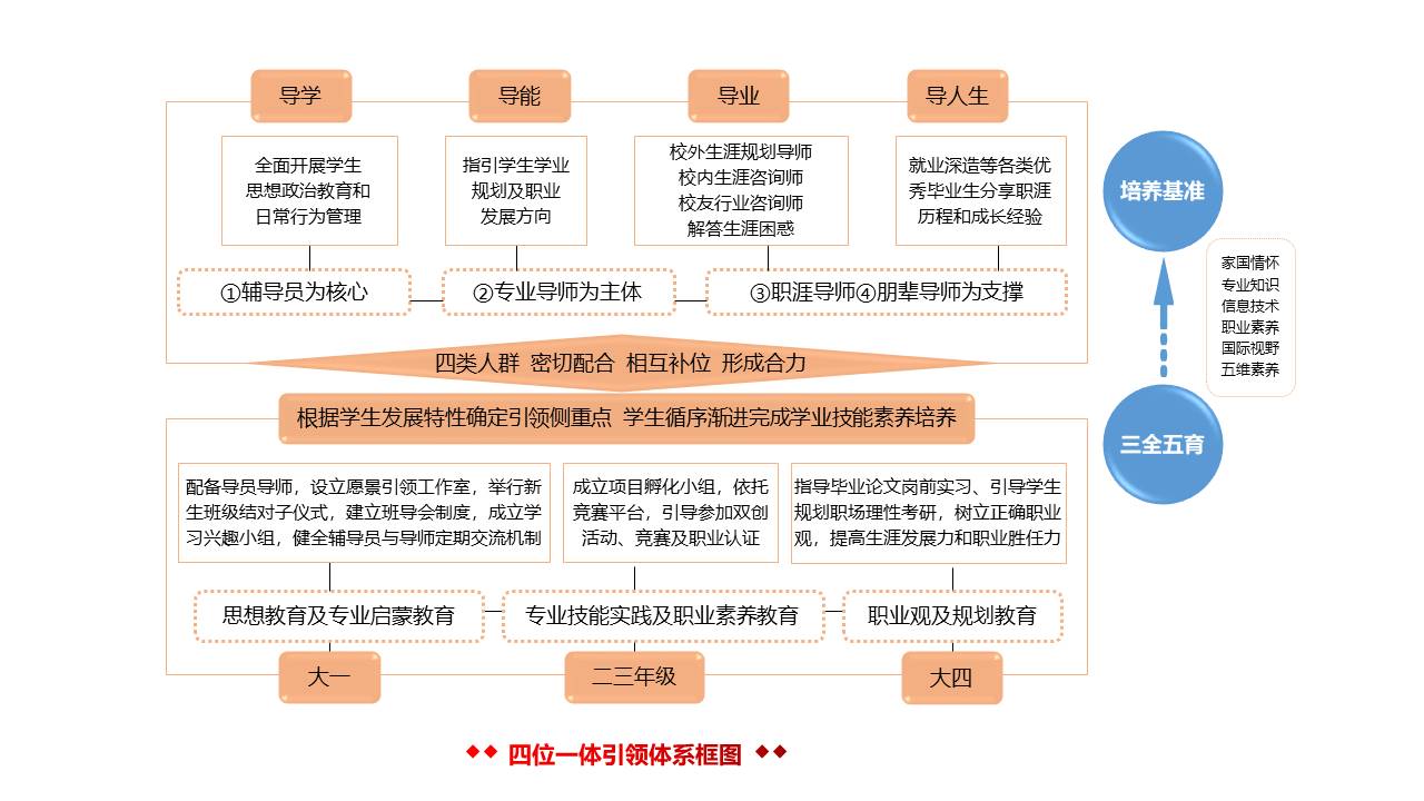 “四位一体引领育人体系”围绕“三全育人”基本要求,以公司“家国情怀+专业知识+信息技术+职业素养+国际视野”五维核心素养为基准,以辅导员为核心、以专业导师为主体、以职涯导师、朋辈导师为支撑,四类人群密切配合,相互补位,形成合力,全员全程全方位覆盖员工职业引领教育(框图如下)。
