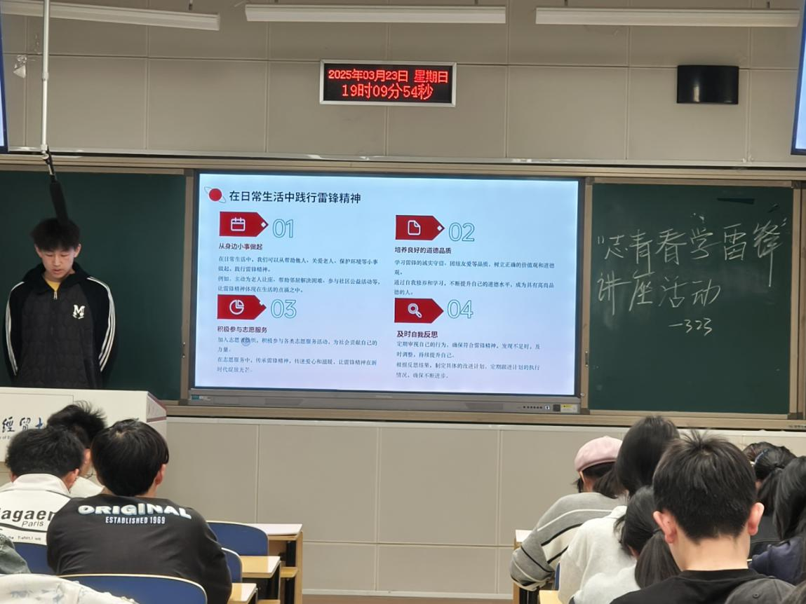 活动伊始,主讲人通过展示雷锋同志的生平事迹和经典故事,带领同学们走进了雷锋的世界,深刻领会雷锋精神的核心内涵。他指出,雷锋精神不仅仅是简单的做好事,更是一种对人民无私奉献、对工作高度负责、对生活积极乐观的态度,这种精神跨越时空,在新时代依然散发着璀璨光芒,激励着一代又一代青年为实现中华民族伟大复兴而不懈奋斗。