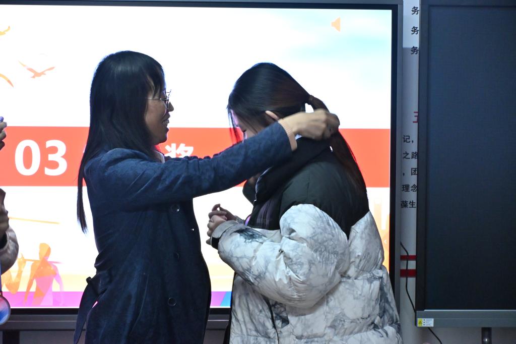 在热烈的掌声中,祃海霞、闫亮为排球队员逐一颁发并佩戴奖牌,表彰他们的拼搏与付出。
