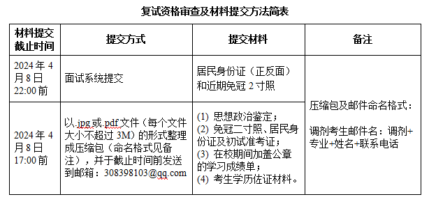公司已于2023年3月26日在公司官网公布了《2024年硕士研究生复试录取工作实施细则》,关于复试形式、复试内容、审核材料的内容及提交方式、调剂、录取等相关内容,请考生仔细查阅该通知(/info/1111/3743.htm)。本公司调剂复试工作计划于4月8日左右开始。