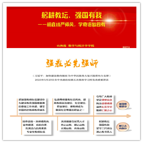 2023年6月8日,由教学评估与教师教学发展中心主办、数学与统计学公司承办的数统智汇(第39期)教学沙龙顺利举行。公司党委书记祃海霞依托学习通课程做“明底线严师风学寄语做四有”师德建设沙龙。