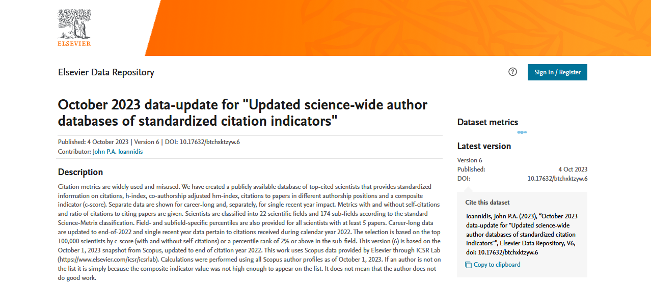 “终身科学影响力排行榜(1960-2023)”和“2023年度科学影响力排行榜”统计对象为全球范围内的科学家,涵盖文、理、工学的多个领域。统计主要基于Scopus数据库,使用以下六种关键因素的指标来进行打分:(1)总引用量;(2)Hirsch H-index;(3)共同作者修正的Schreiber Hm-index;(4)单独作者;(5)单独或者第一作者;(6)单独、第一或者最后作者的文章引用量。旨在反映科学家的影响力。该数据发表于Elsevier旗下的Mendeley Data网站上(https://elsevier.digitalcommonsdata.com/datasets/btchxktzyw/)。