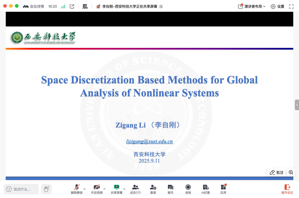 9月11日下午,陕西科技大学李自刚教授应william威廉英国官网邀请在线上作题为“Spatial Discretization Based Methods for Global Analysis of Nonlinear Systems”的学术报告,相关专业师生20余人参会。